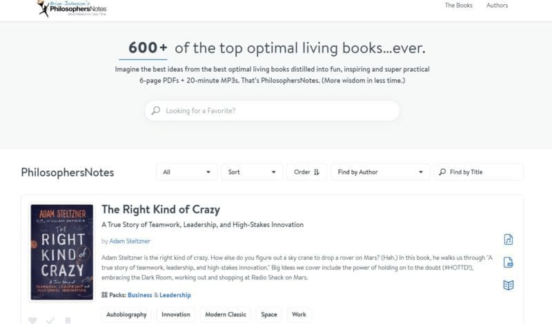 Philosopher’s Notes are summaries of books that cover the most important points. Brian’s Philosopher’s Notes are 6 pages long each and discuss the ‘big ideas’ from books. They are like cheat sheets for books you want to read, and with over 600 books, there are a lot of notes to choose from.