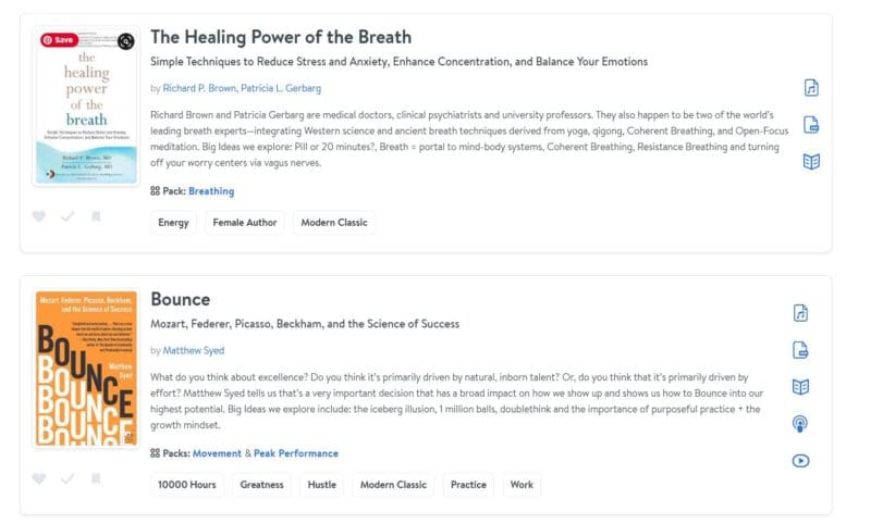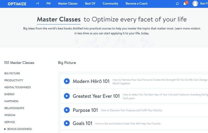 Optimize.me is a personal development site by Brian Johnson. It offers wisdom through summaries of books, daily lessons, and master classes. This is a site that you can go back to daily and grow as a person just a little bit every single day. This is my kind of site! Besides Mindvalley, I don’t know of another site like this. Optimize offers three big things on their site.