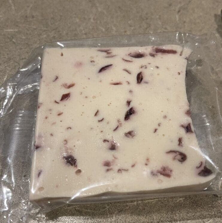 Every year they change one of the cheeses. My favorite has been a Gouda cheese. It reminded me Caciocavacllo cheese. We used to eat a lot of that cheese before we went vegan. It had a small tang to it, not big like other Violife cheeses. And to me, it just tasted buttery. I really liked it. But they did’t include that this year. Instead, they added a cranberry mozzerla cheese.